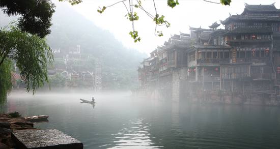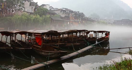沱江河是古城鳳凰的母親河,她依著城墻緩緩流淌,世世代代哺育著古城兒女。坐上烏蓬船,聽(tīng)著艄公的號(hào)子,看著兩岸已有百年歷史的土家吊腳樓,別有一番韻味。順?biāo)拢┻^(guò)虹橋一幅江南水鄉(xiāng)的畫(huà)卷便展現(xiàn)于眼前:萬(wàn)壽宮、萬(wàn)名塔、奪翠樓……一種遠(yuǎn)離塵世的感覺(jué)悠然而生。沱江的南岸是古城墻,用紫紅沙石砌成,典雅不失雄偉。城墻有東、北兩座城樓,久經(jīng)滄桑,依然壯觀?! °铀宄?,城墻邊的河道很淺,水流悠游緩和,可以看到柔波里招搖的水草,可以撐一支長(zhǎng)篙漫溯。沿沱江邊而建的吊腳樓群在東門(mén)虹橋和北門(mén)跳巖附近,細(xì)腳伶仃的立在沱江里,象一幅永不回來(lái)的風(fēng)景。