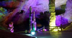波月洞的“鵝管”長短不一,參差錯(cuò)落,密密匝匝,直掛天穹,在逆光燈照下,如萬千瑪瑙翡翠垂吊空間,晶瑩剔透,閃閃發(fā)光;觀之,不能不驚吧大自然神奇的創(chuàng)造力。