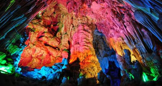 洞內(nèi)寬大幽深,洞中有洞,樓上藏樓,鐘乳石千姿百態(tài)、三步一景、五步一閣,萬千景象,令人嘆為觀止,有南宮、北宮、瑤池仙境、海底世界等四大景區(qū)、10多個廳堂,100多個景點。